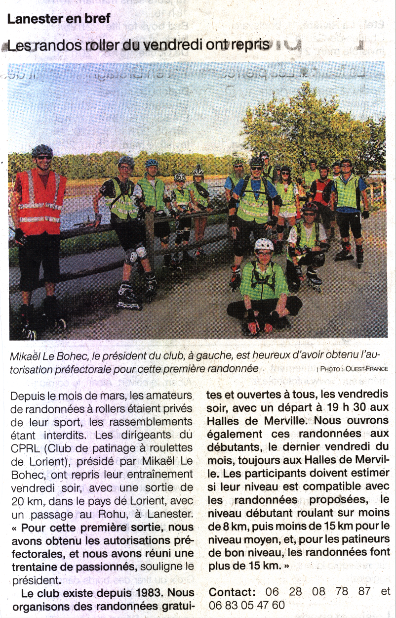 Voilà déjà un mois que le CPRL a pu reprendre ses randonnées rollers (et quads) dans Lorient et ses alentours, et c’est avec plaisir que nous accueillons de nouveaux patineurs et touristes depuis cette reprise. Ouest-France a même immortalisé la 1ère randonnée post-confinement (rando du 17 juillet) :